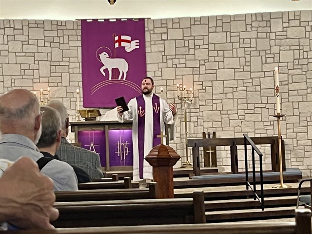 Trinity Lutheran Church congregation members stood in line to receive a dark cross mark made of palm ashes ...