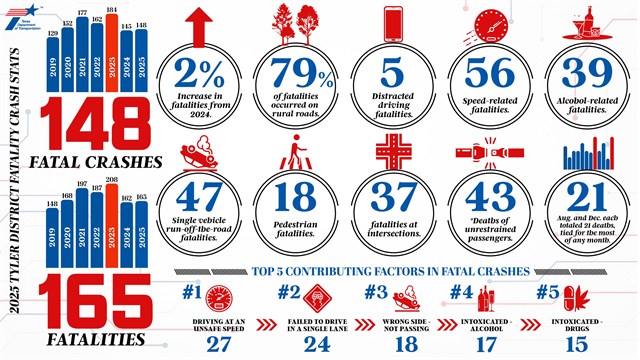 “Although we saw a slight increase in fatalities in 2025, we remained well below our five-year average and continue to see positive trends in several areas,” said Vernon Webb, engineer for the Tyler District. “However, pedestrian fatalities remain a significant concern. With more pedestrians on our roadways, combined with speeding, distracted driving and impaired motorists, the risk of serious crashes increases.”
